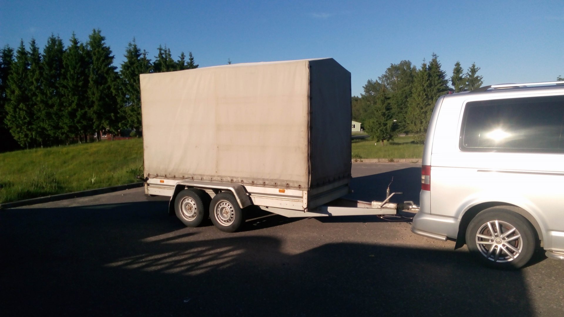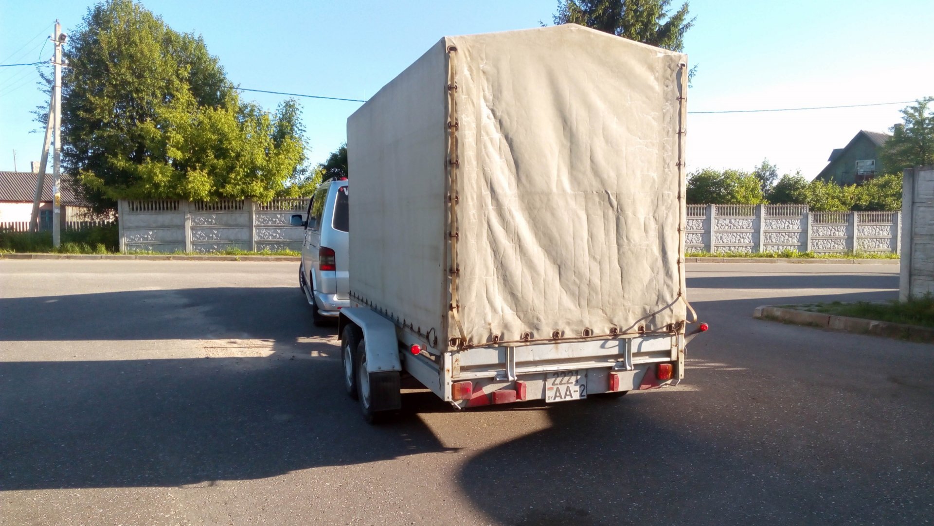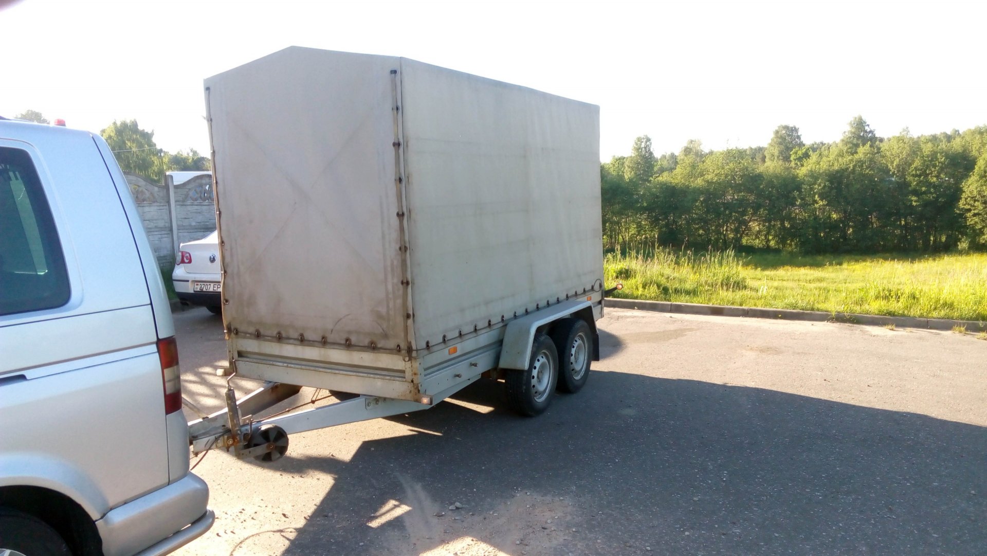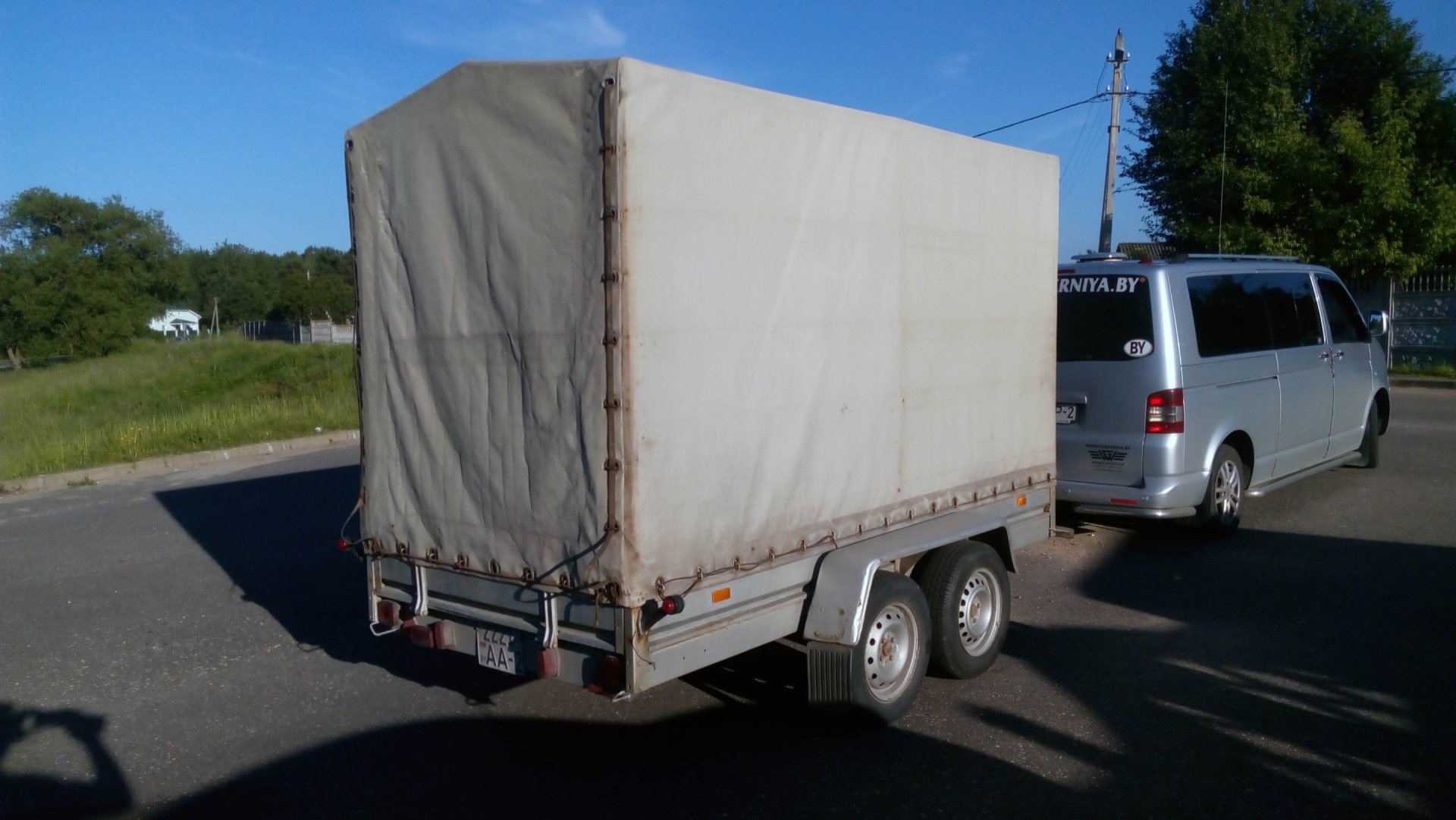 Прицеп Newiadow для буксировки за автобусом или микроавтобусом. Оснащён металлическими бортами, деревянным напольным покрытием и мягким тентом. Загрузка сзади. Грузоподъемность 1500 кг. Размеры грузового отсека: длина 310 см., ширина 130 см., высота 180 см.