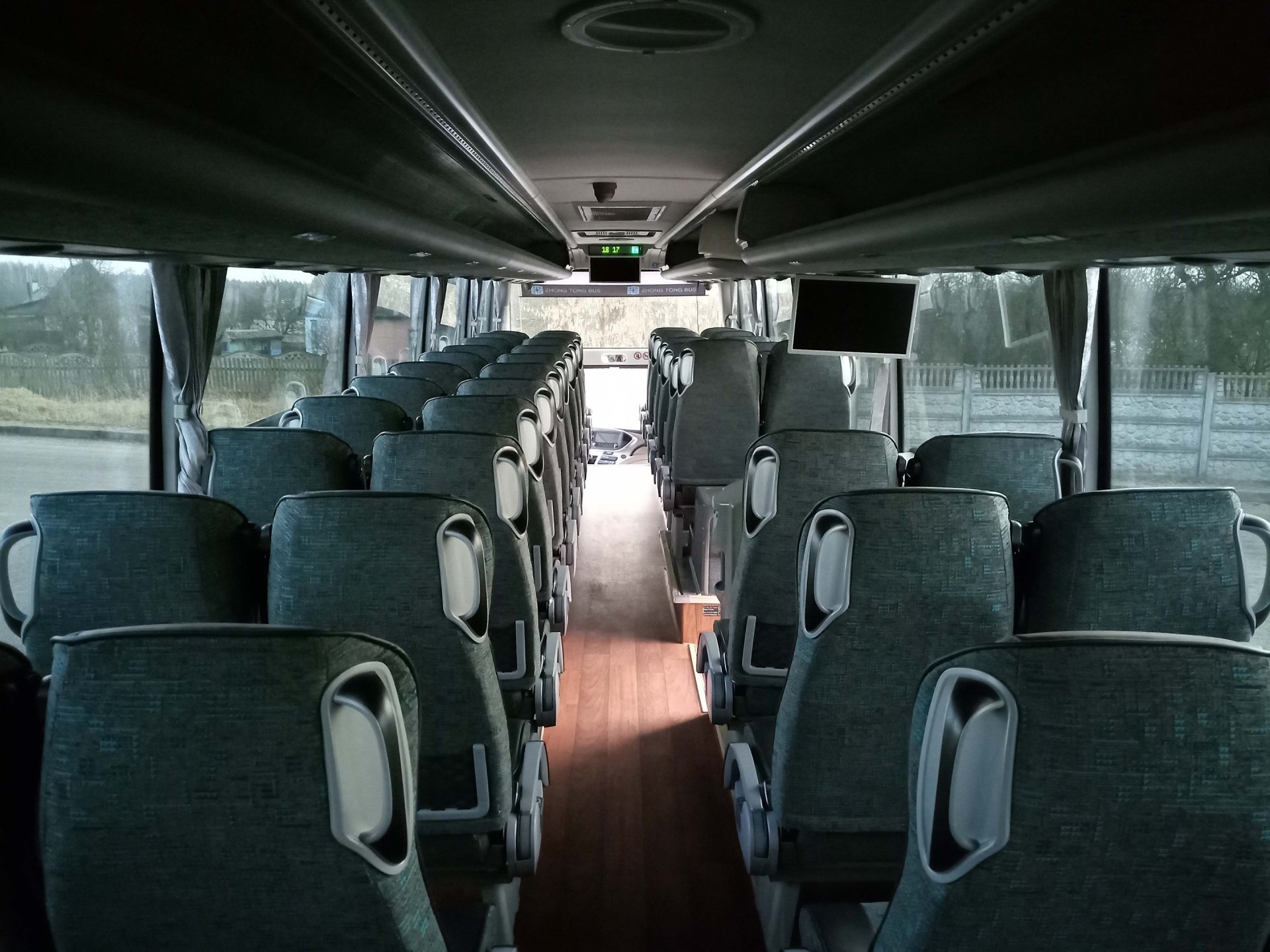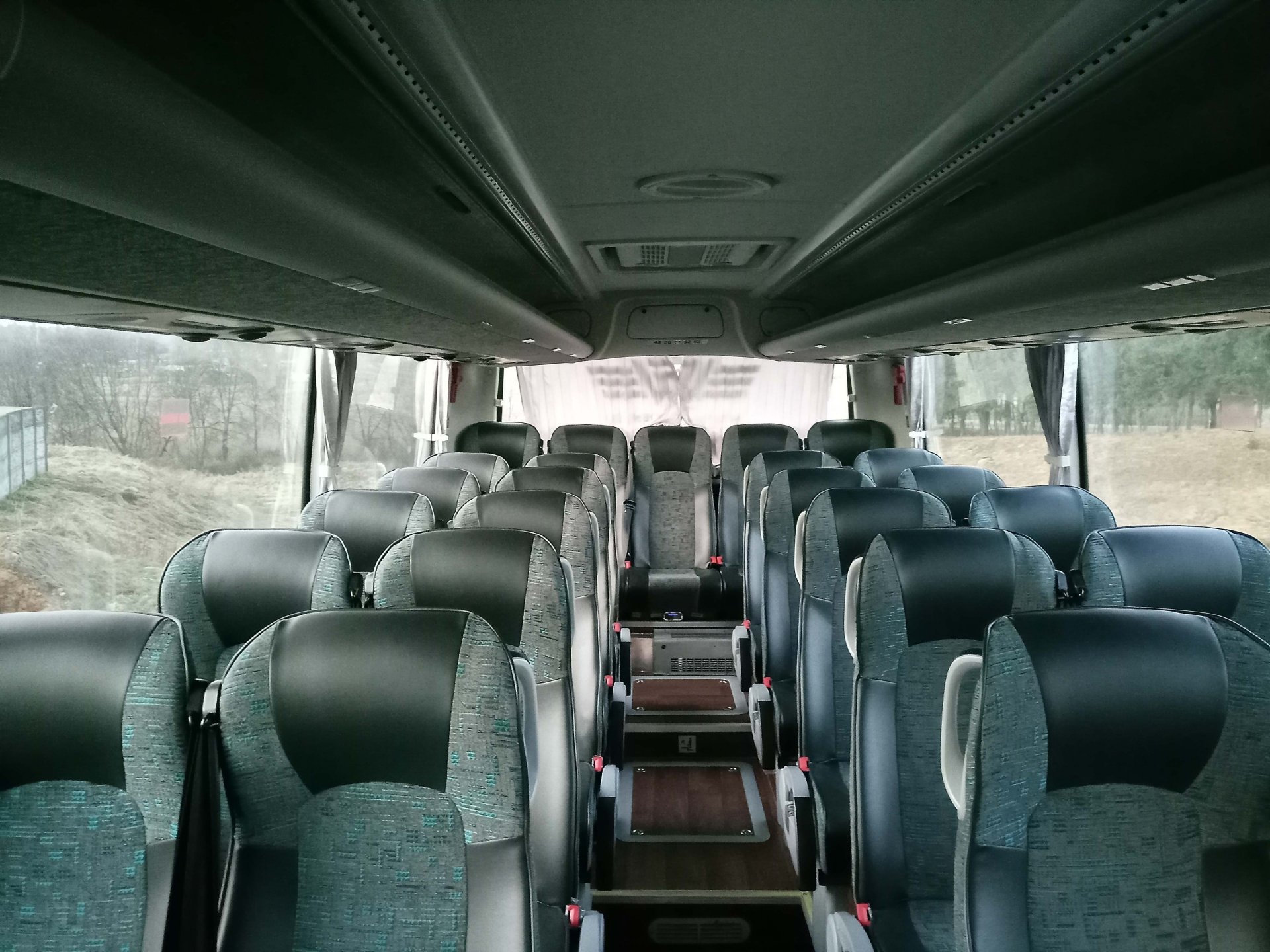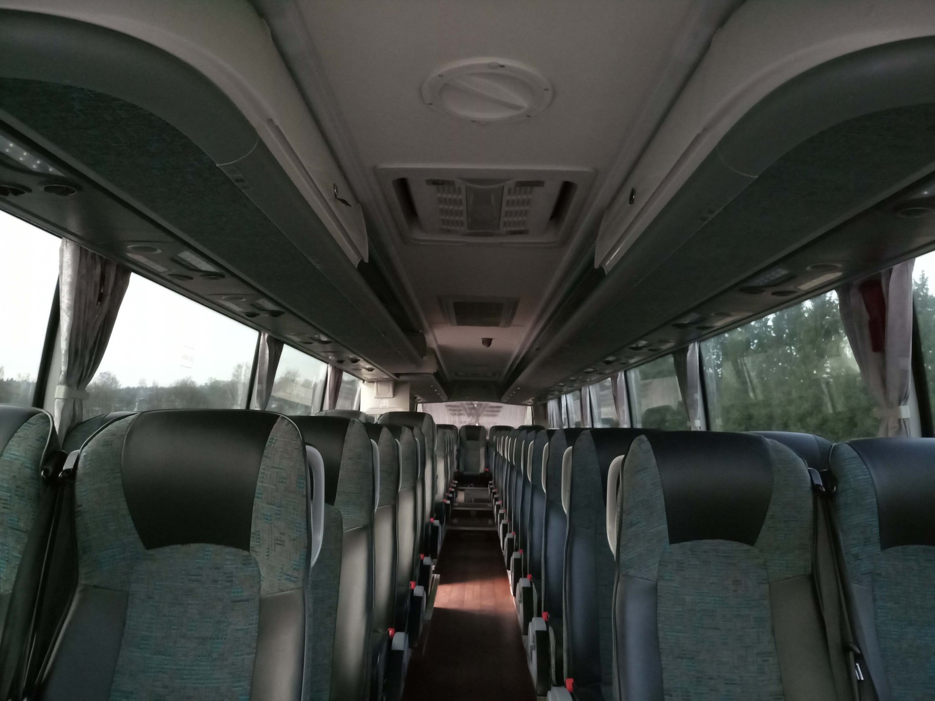 Автобус оборудован тонированными стеклопакетами и полноразмерными шторами, что прекрасно защищает от палящего солнца летом и сберегает тепло в автобусе зимой. Для каждого ряда сидений имеется индивидуальная вентиляция, подсветка и громкоговоритель аудиосистемы.