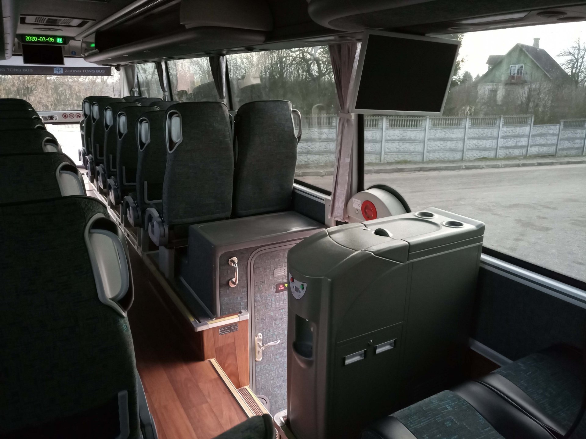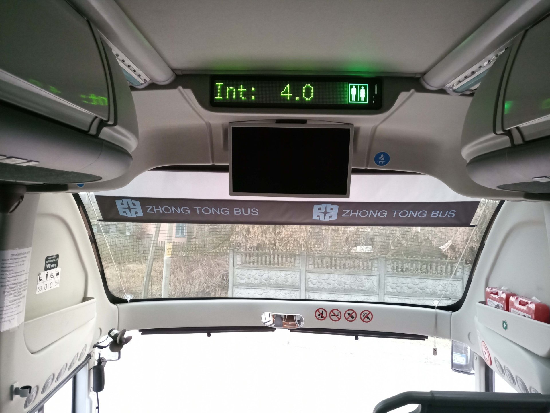 Автобус оборудован мультимедийной аудиосистемой с двумя мониторами для салона и микрофоном. Так же есть небольшой холодильник для перевозки пиши и кулер для охлаждения/нагрева воды (кулером разрешается пользоваться только во время стоянки автобуса).