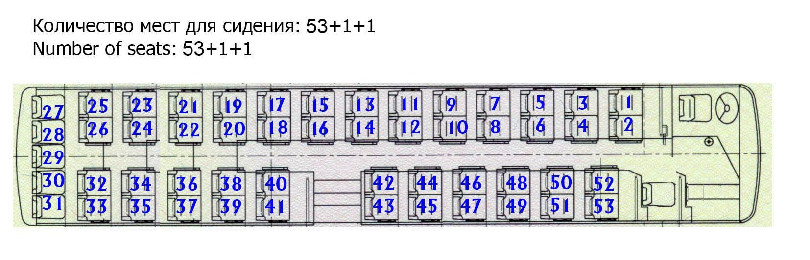 Большой автобус туристического класса на 53 пассажирских места + 1 водитель + сиденье для гида.